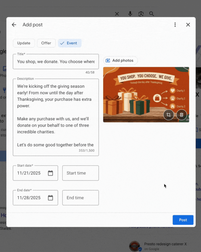 Google Posts are how you tell Google what’s happening right now at your business.