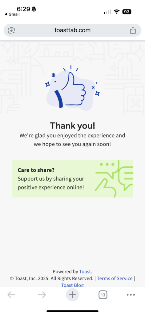 Here are examples of Toast digital receipts with the Guest Feedback feature enabled. When customers engage with this survey (thumbs up/down and optional comments), the results stay internal: